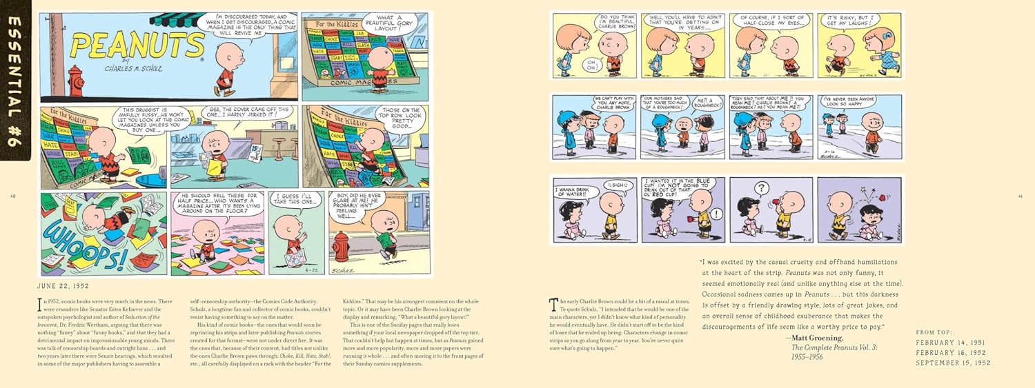 The Essential Peanuts by Charles M. Schulz: The Greatest Comic Strip of All Time falls into a category of books that I’ll call Big Books About Peanuts, or BBAP for short.  A fair number of BBAPs exist, and they tend to pop up around Peanuts anniversaries. They fall into two subcategories: books that tell the history of Peanuts, though they may have a few strips peppered in, and books that focus on reprinting strips selected as highlights, though they may have some history peppered in. The Essential Peanuts tried to thread the needle between those two types of BBAPs, with roughly equal weight given to the history and the strip reprints.