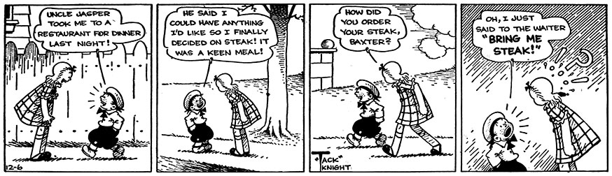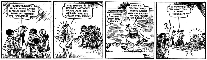 But curiosity drove me, so I sought a collection of Little Folks so that I could see what it was like, but no collection had ever been issued. As such, it fell to me to make one. Just released is Little Folks: Dailies, 1930, collecting all the Monday-through-Saturday strips from the first year of the run (and as it started early in the year, that’s almost 300 strips.) Now, I’m not saying this is some hidden masterpieces — it’s a competently-done jokey kid strip of its time. But if you think it wasn’t reasonable that this could be confused with Peanuts, the dailies had a couple interesting features: the strip was almost always four evenly-sized panels (not common at the time), and adult faces and voices never appear (again, in the dailies; the rules were different for the Sunday strip once it started.) So in some aspects, these are two similar kid strips we’re talking about.