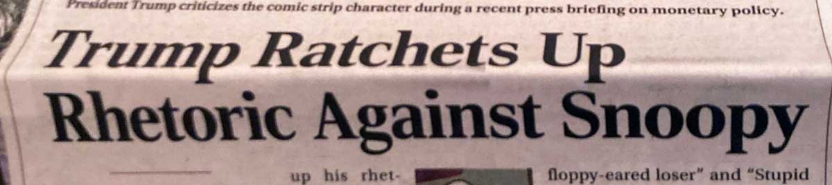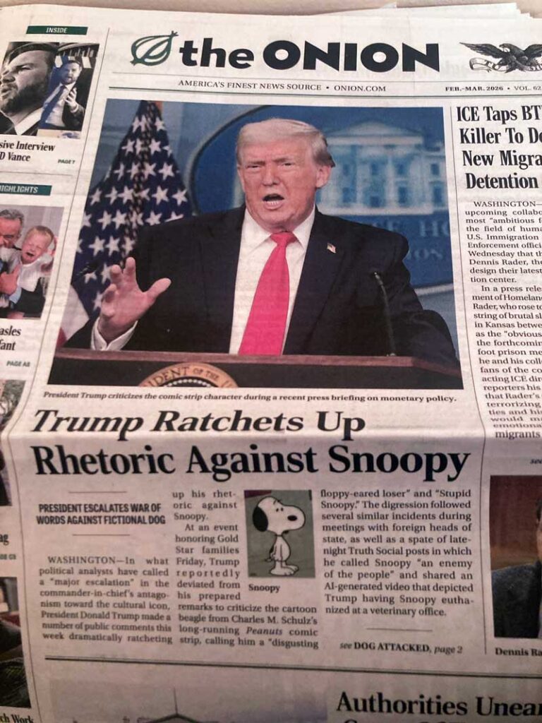 I subscribe to the print edition of The Onion, which is America’s Finest (made-up) News Source. This is actually a paper with a long history, but switched to web only for a while. When they came back to print, I jumped on board to help fund this very special outlet that is doing the good work. But I was not prepared to get the new issue in the mail and see that as their front-and-center story, they were covering US President Donald J Trump and his ongong attacks on Snoopy.