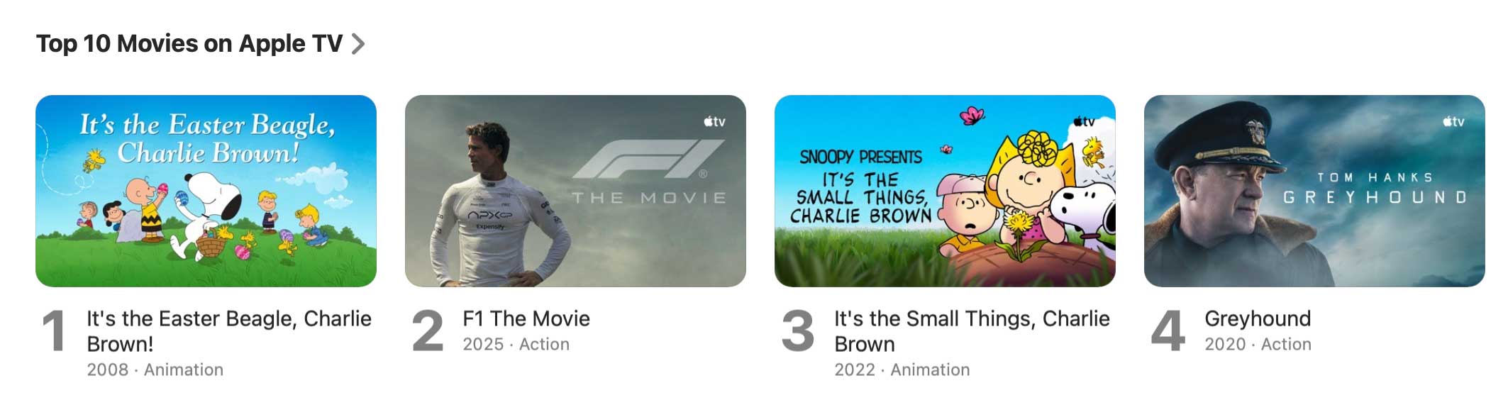 Today, I looked at the Top Movies listing on Apple TV. #1 was It’s The Easter Beagle, Charlie Brown (which they count as a “movie” as it is neither a series nor a sports event.) #2 was F1, an Academy Award-winning film that Apple had spent over $200 million making. #3 was Snoopy Presents: It’s the Small Things, Charlie Brown, a four year old Peanuts special. Is Peanuts getting a blip from Easter? Certainly. But the fact that Peanuts material is regularly in play on this list put it well in line with what Apple seems willing to spend money on.